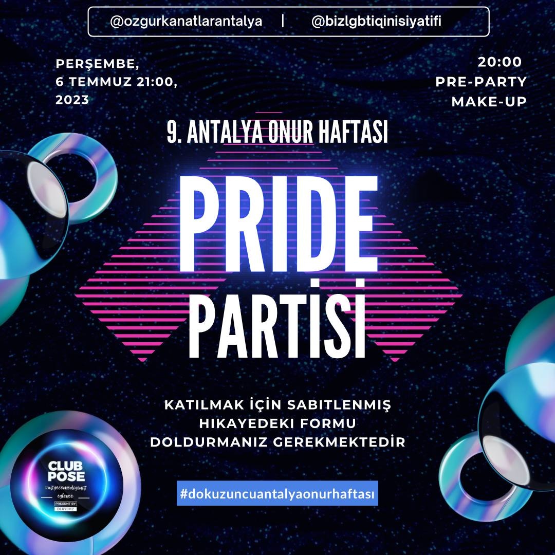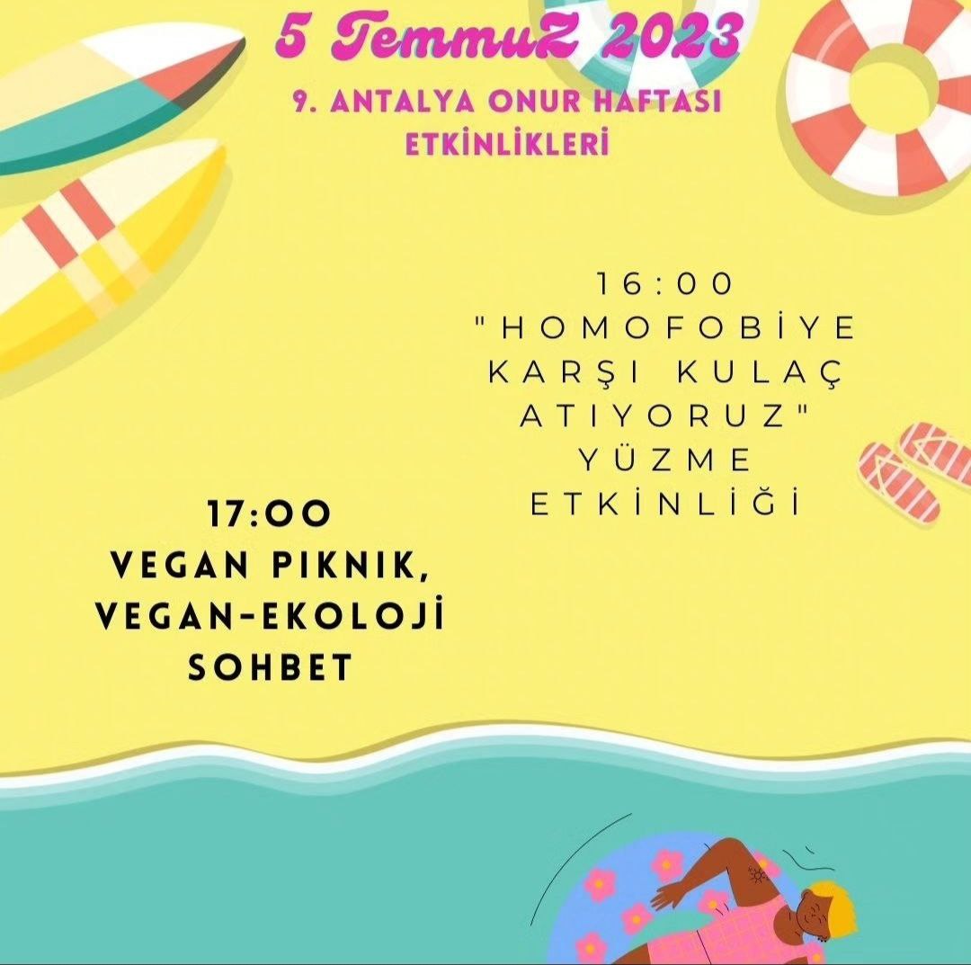 03-09 Temmmuz 2023 tarihleri arasında söyleşiler, paneller düzenleyerek, açık alanlarda, pikniklerde görünürlük sağlayarak, şenliklerde, partilerde dans ederek, eğlenerek Onur Ayımızı kutladık. Antalyanın 9. Onur Haftasında yerleşik ve turist yabancılar için de first Attalos Pride’ı eşzamanlı yürüttük.