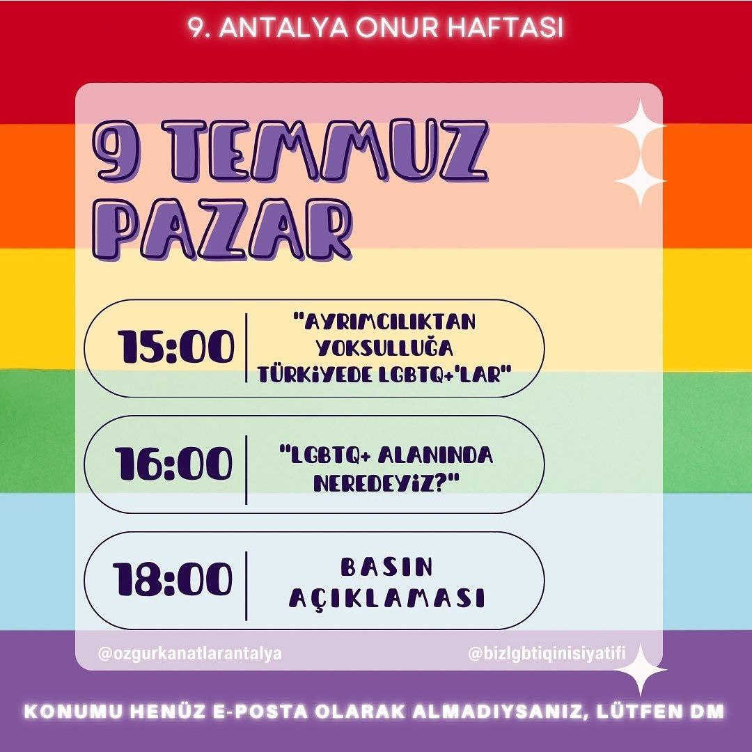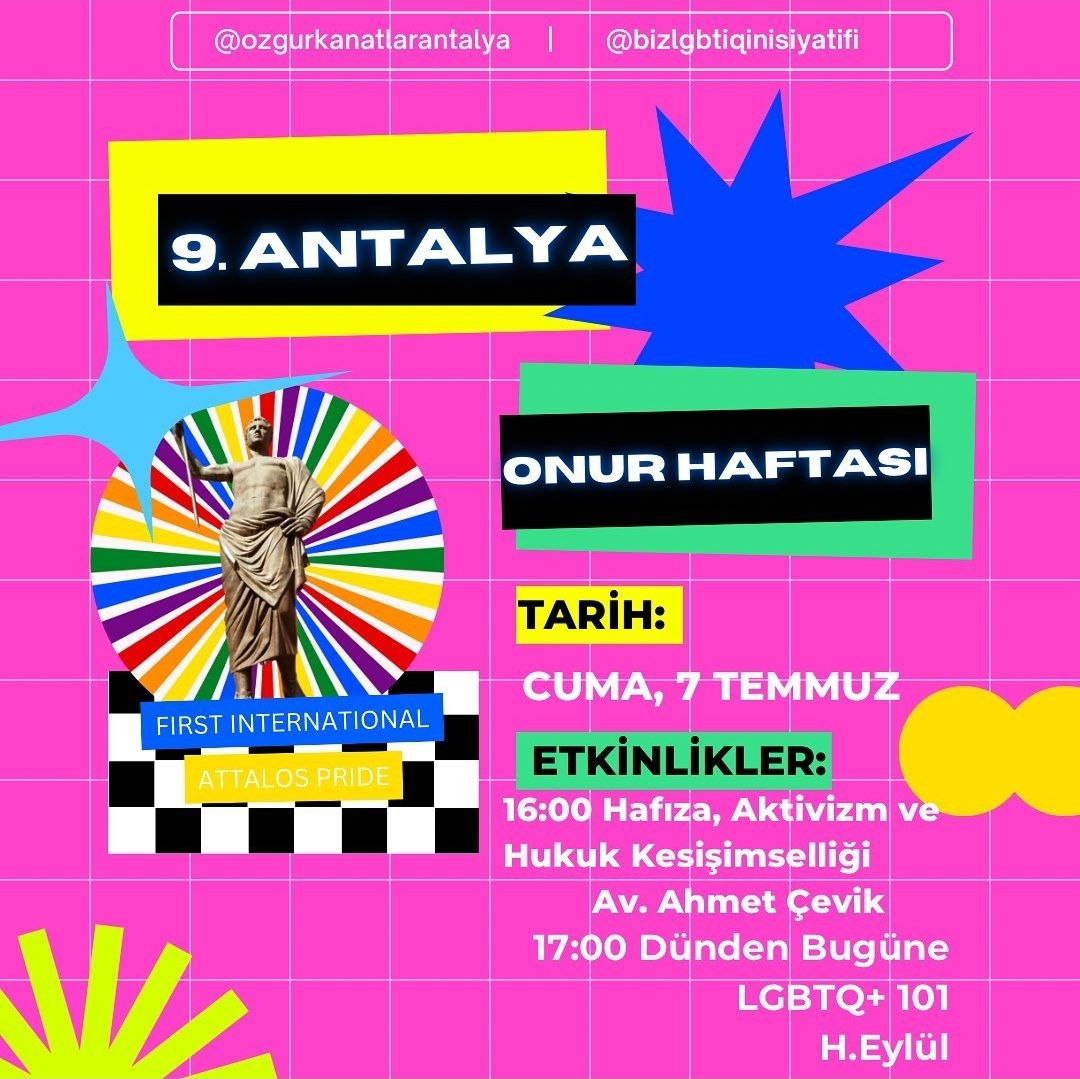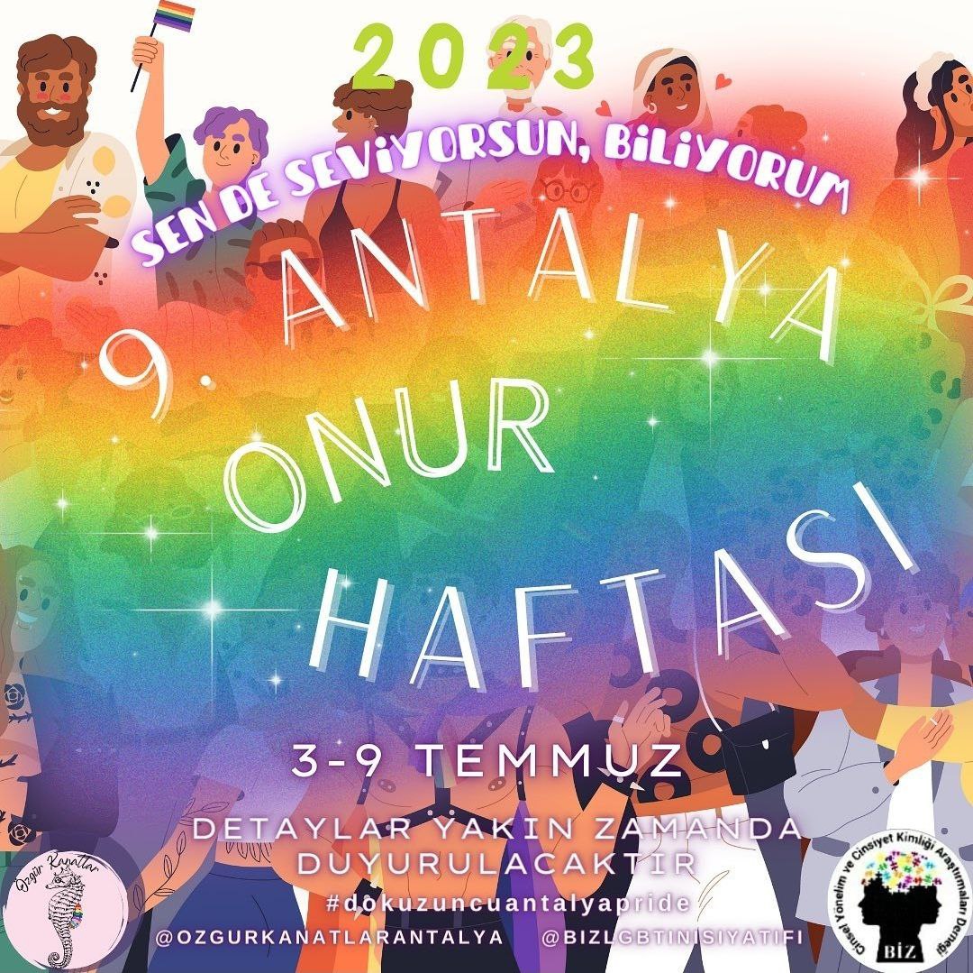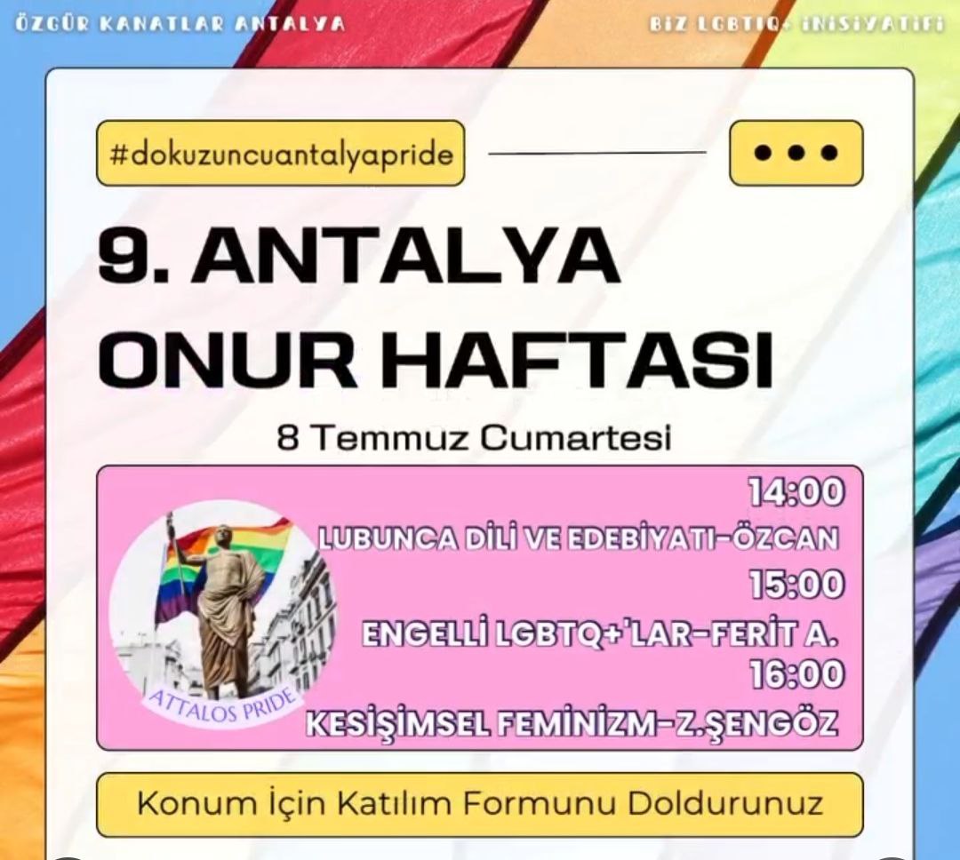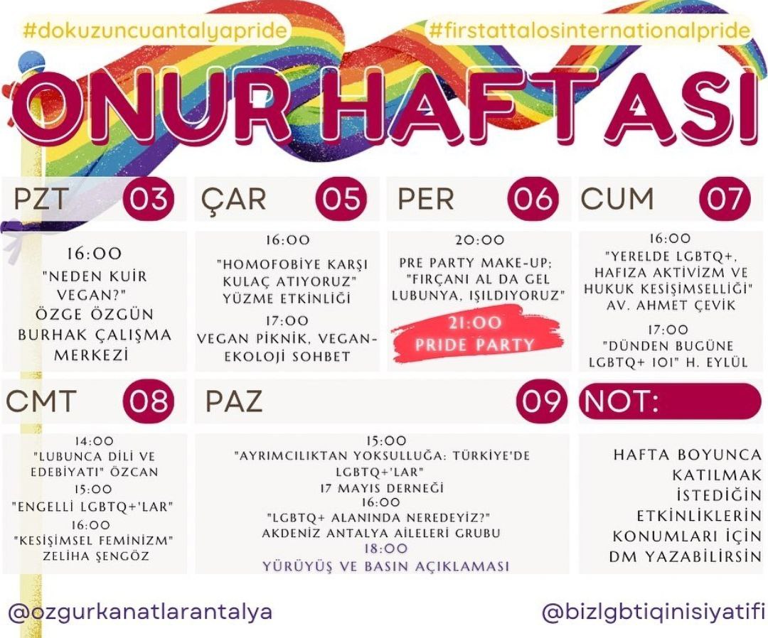 Antalya 9. Onur Haftası ve First Attalos Pride Gerçekleşti. Özgür Kanatlar ve Biz LGBTQ+ İnisiyatifleri Antalyanın 9. Onur Haftasını Birlikte Örgütledi.